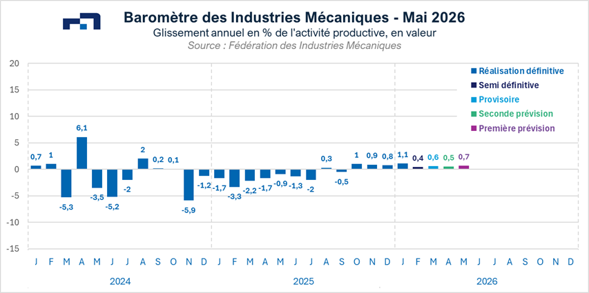 Les variations positives prévues par le baromètre des industries mécaniques au premier trimestre de 2026 ont été revues légèrement à la baisse, tout en restant positives : +1,1 % au mois de janvier 2026, + 0,4 % au mois de février, + 0,6 % au mois de mars, + 0,5 % au mois d’avril et + 0,7 % au mois de mai 2026.