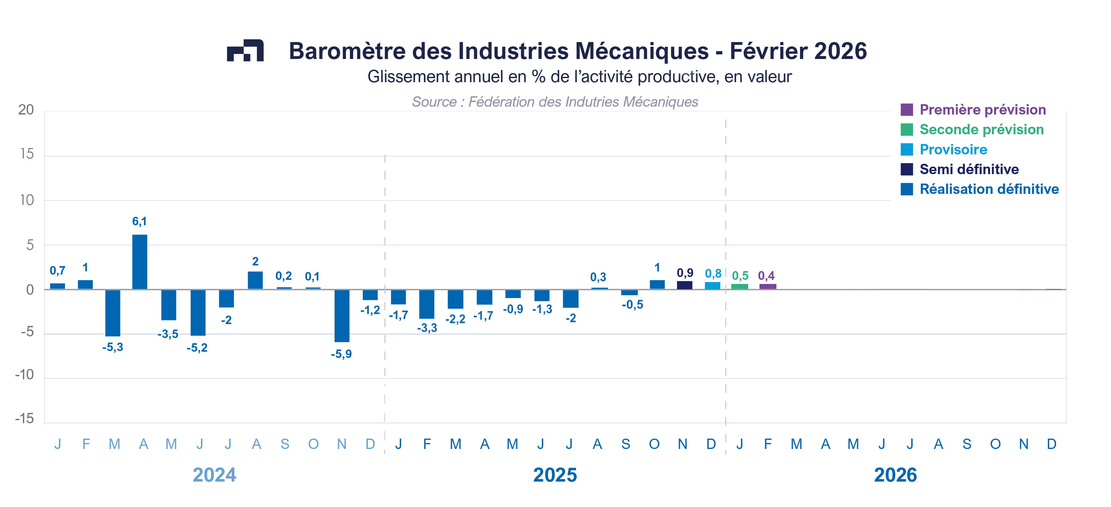 + 0,5 % en janvier et + 0,4 % en février 2026. Malgré cette amélioration, l’évolution des facturations des industries mécaniques devraient légèrement reculer pour l’ensemble de l’année 2025 (- 0,9 %).